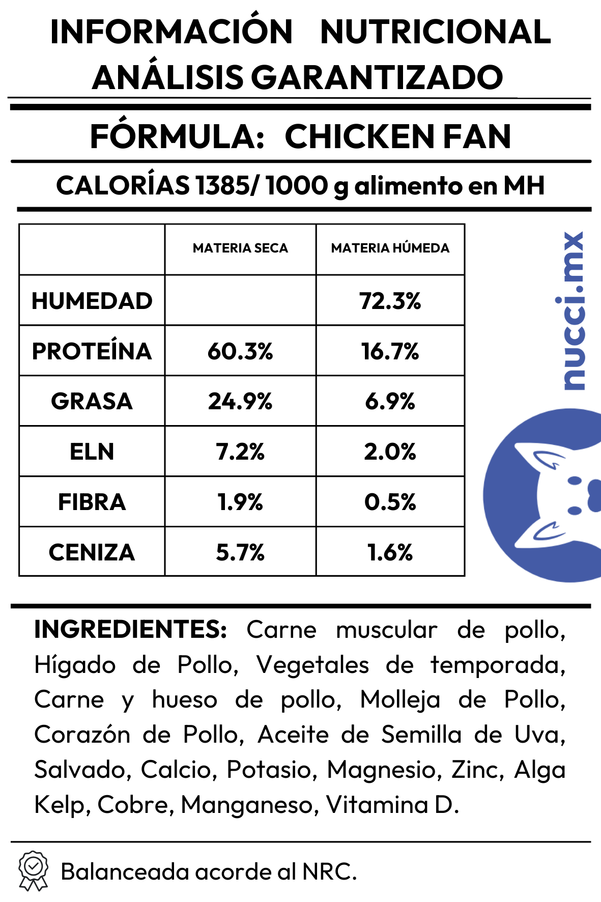 Carne muscular de pollo, Hígado de Pollo, Vegetales de temporada, Carne y hueso de pollo, Molleja de Pollo, Corazón de Pollo, Aceite de Semilla de Uva, Salvado, Calcio, Potasio, Magnesio, Zinc, Alga Kelp, Cobre, Manganeso, Vitamina D. 🍠🥦🥩