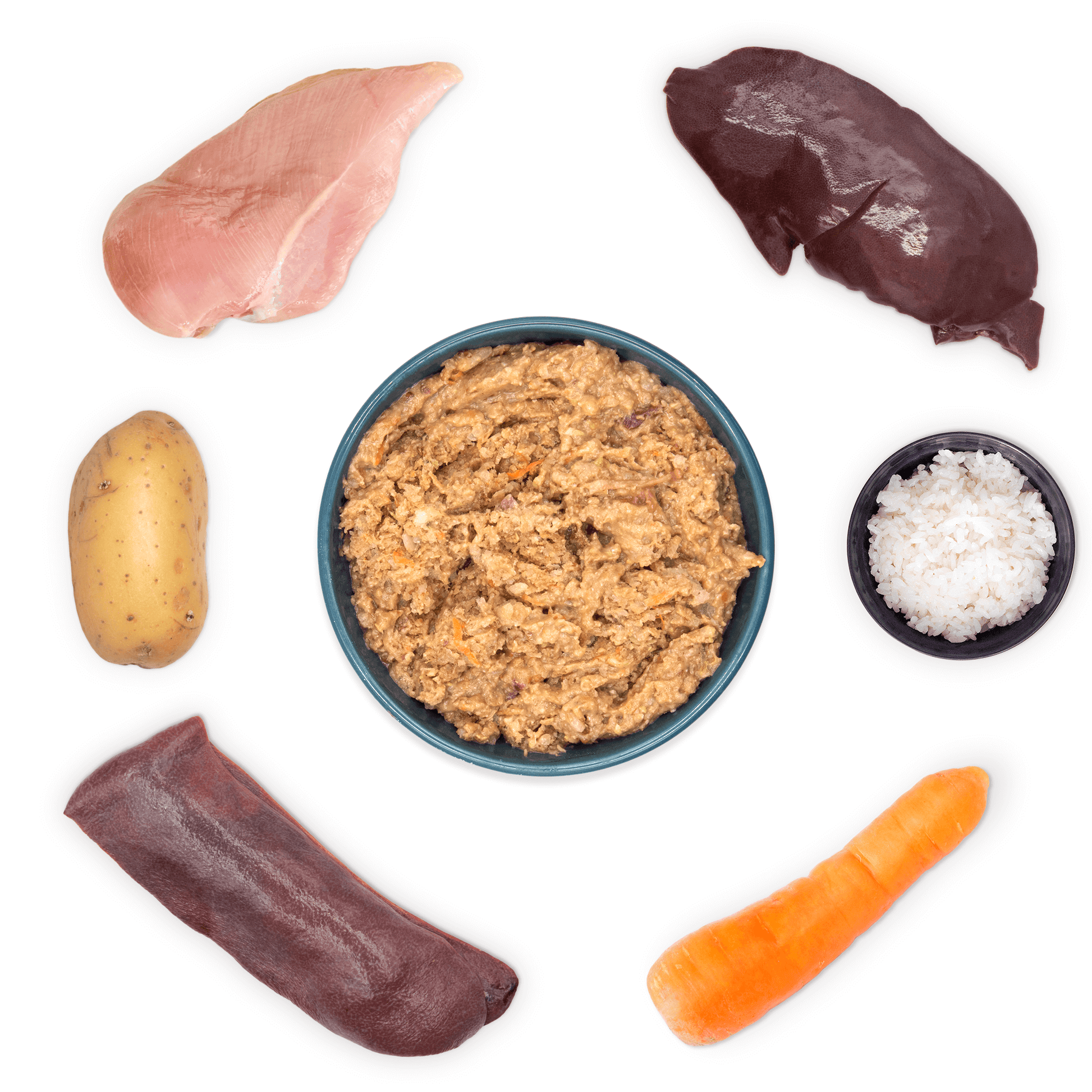 - 🍚 Arroz, 🍠 Camote, 🥔 Papa, 🌾 Avena, 🍗 Carne Magra de Pollo, 🍌 Plátano, 🥕 Zanahoria, 🥒 Chayote, 🎃 Calabaza, 🐖 Hígado de Cerdo, 🍳 Huevo, 🐖 Grasa de Cerdo, 🐖 Riñón de Cerdo, 🌰 Linaza, 🌻 Semilla de Girasol, 🐄 Hígado de Res, 🐖 Bazo de Cerdo, 🍶 Calcio, 🍬 Metionina, ⚖️ Cloruro de Potasio, 🌊 Selenio, 🧪 Colina, 🐾 Taurina, 💊 Zinc, 🌿 Kelp, 🌰 Vitamina E, ☀️ Vitamina D.