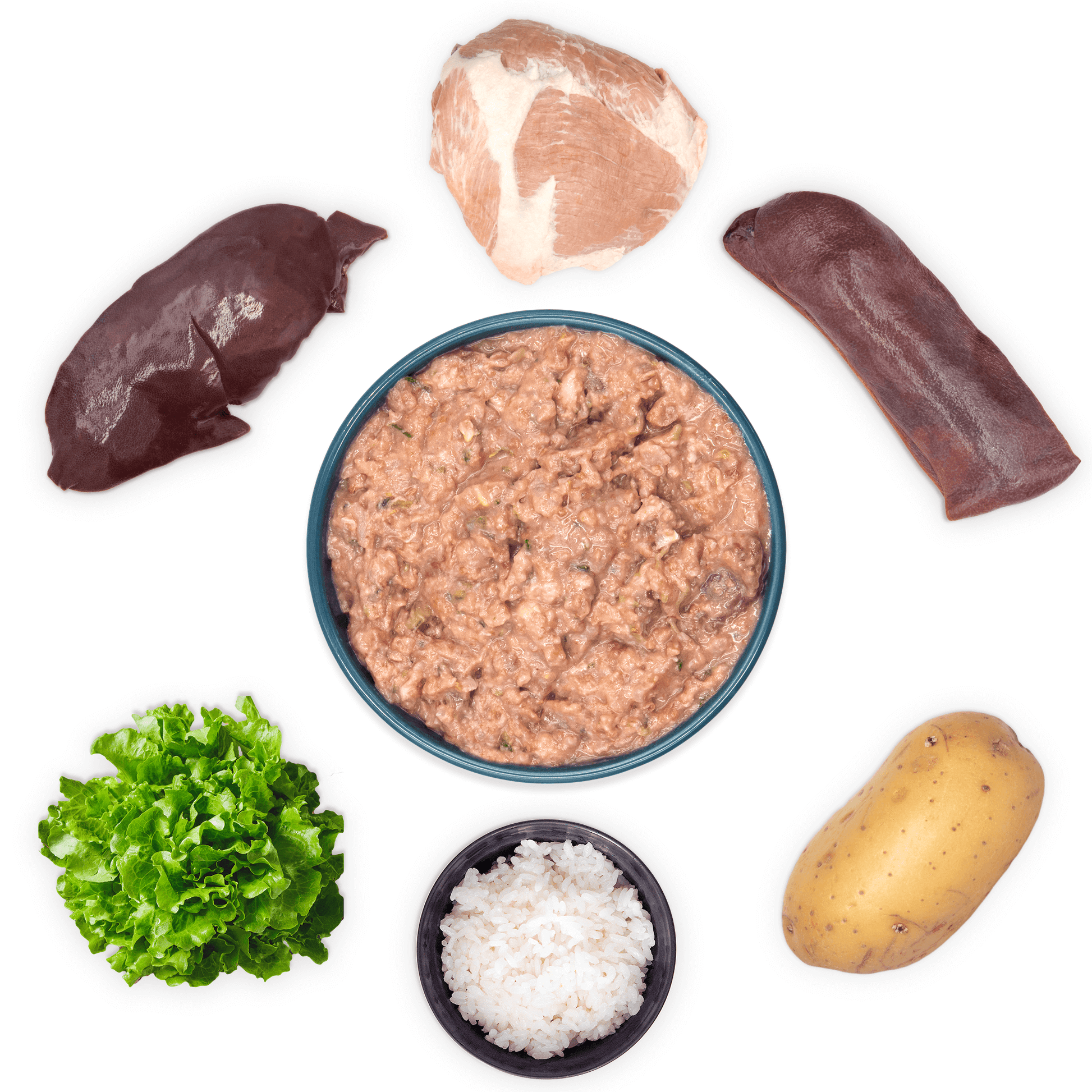 🥦 Ingredientes de Calidad: Carne de cerdo, Papa y/o camote, Avena, Arroz, Vísceras de cerdo, Hígado de Res, Sardina, Vegetales de temporada, Huevo, Salvado de trigo, Grasa de Cerdo, Calcio, Colina, Magnesio, Taurina, Vitamina E, Zinc, Alga Kelp, Vitamina D, Manganeso, Glucosamina, Condroitina.